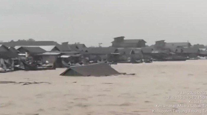 Banjir rob melanda Desa Kuala Simbur, Kecamatan Muara Sabak Timur, Kabupaten Tanjung Jabung Timur. Akibat air laut pasang yang tinggi, satu unit rumah warga dilaporkan hanyut terbawa arus.