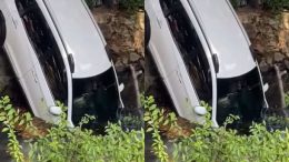Kecelakaan tunggal dialami sebuah mobil pribadi berwarna putih yang melintas di kawasan Kelapa Gading, Jakarta Utara siang ini, Rabu 6 Agustus 2025. Nampak mobil nyusruk…
