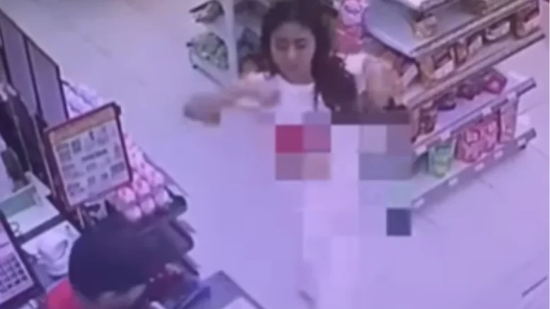 Dalam rekaman kamera pengawas yang beredar luas, terlihat seorang perempuan berdiri di depan meja kasir minimarket. Tanpa alasan yang jelas, ia secara tiba-tiba mengangkat pakaian bagian atasnya dan memperlihatkan tubuhnya ke arah kamera.